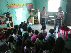 Guatemala’s multiple languages present both challenges and great opportunities for us. One of our regional coordinators, Carlos Pos Ben, speaks Kakquichel, while people in the community of Tzanchaj, which we’ve partnered with, speak Tz’utujil. When Carlos is working with the teachers and students of the first three grades, he relies heavily on assistance from the teachers. Carlos and the local teacher read a story “tag-team” style. The teacher will interject with Tz’utujil words when he realizes that the students won’t understand something. In this way, the students get further exposure to books, their mother language is reaffirmed, and the kids can enjoy the book instead of be frustrated by not understanding what is going on.